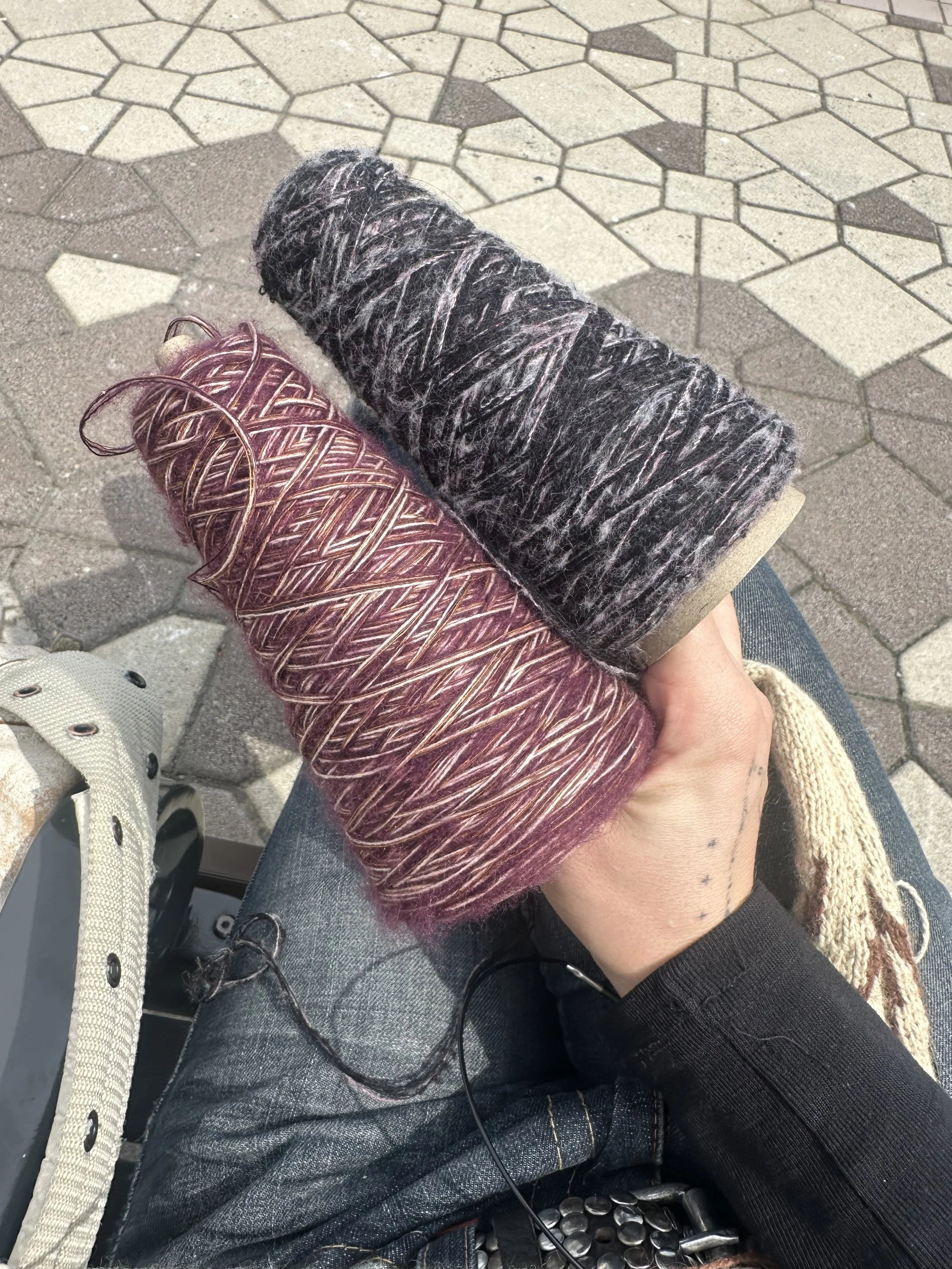 Inspired by phones and beers. I looked through my old drunk msgs to include here but I just hurt my feelings. I purchased the grey yarn from Masuzakiya yarn store in Osaka. I recommend it if you are in the area, all the yarns are sorted by country of origin and the owners feel passionate about the products. The black cotton yarn is left over from another project